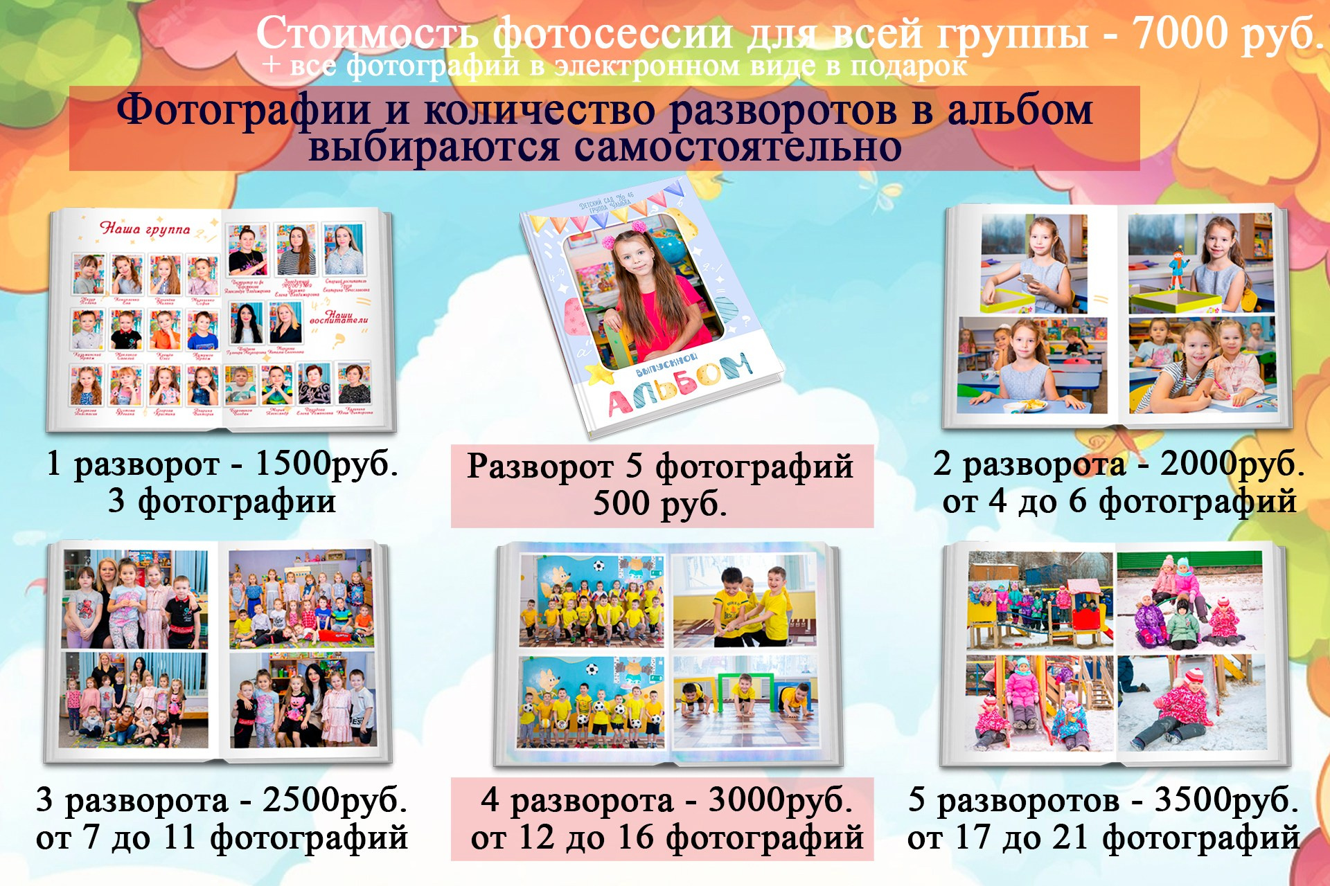 - Фотосессия : В первый день съемки оплачивается электронная версия фотографий, цена которой со скидкой 7000 руб. за всех, если в Вашем коллективе набирается 15 альбомов. Когда детей меньше 15 или без печати альбомов — фотосессия стоит 1000 руб. с каждого ребенка.